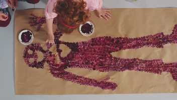 L'oeuvre «Grand visage» donne envie à Passe-Carreau de peindre un grand bonhomme à la manière de Maryse Bouthillier avec Passe-Montagne. L'eau transforme leurs empreintes de peinture. Les enfants sont invités à essayer cette technique fascinante!